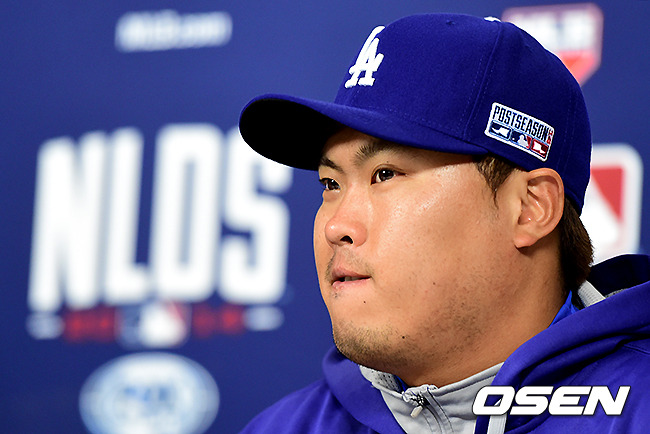 다저스 류현진이 기자회견을 하며 질문에 귀기울이고 있다.