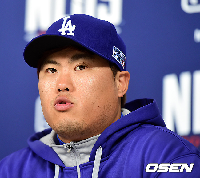 다저스 류현진이 기자회견을 하며 질문에 답을 하고 있다.