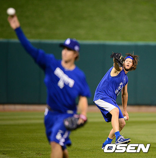 다저스 커쇼, 그레인키가 그라운드에서 개별 훈련을 하고 있다.
