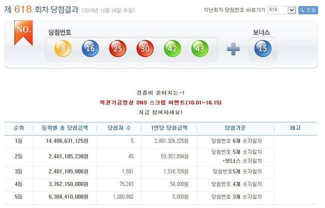 나눔로또는 4일 오후 로또 618회당첨번호를 추첨해 발표했다. 당첨번호는 8, 16, 25, 30, 42, 43이며 2등 보너스 번호는 15이다.