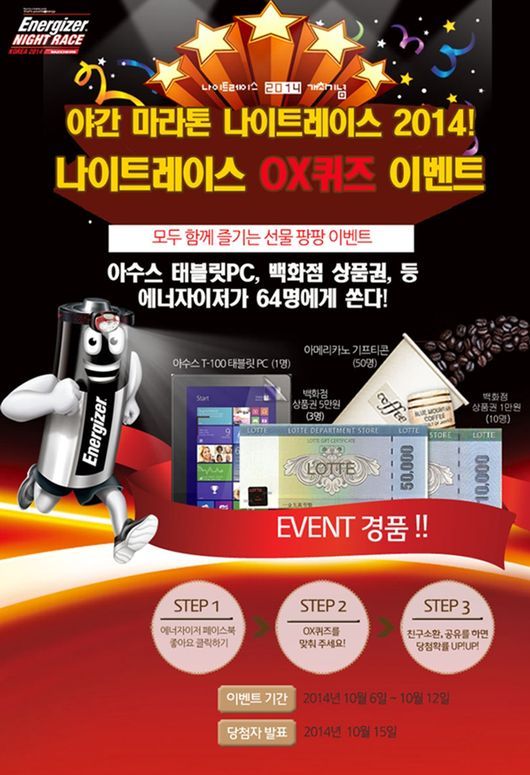 ‘나이트 레이스 OX 퀴즈 Event!’는 6일부터 12일까지 진행된다. 에너자이저 나이트 레이스 공식 페이스북 페이지(https://www.facebook.com/energizerkr)에서 ‘좋아요’ 클릭 후 페이스북 이벤트 페이지에 게재된 나이트 레이스 관련 3개의 OX 퀴즈 정답을 차례대로 맞추고 마지막 단계 페이지에 이름, 핸드폰 번호, 본인의 페이스북 URL 주소를 입력하면 응모가 완료된다.