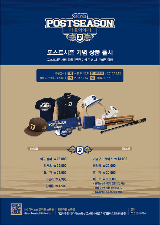 NC 다이노스가 2014 시즌 창단 첫 포스트시즌 진출을 기념해 야구점퍼를 비롯한 티셔츠와 모자, 기념배트, 기념구 등 다양한 상품을 출시했다고 6일 보도자료를 통해 밝혔다.