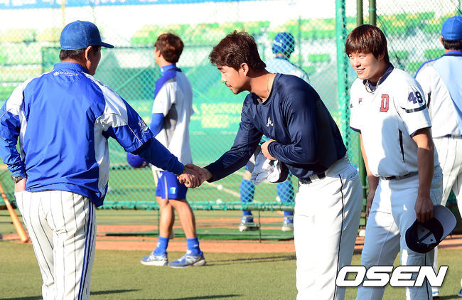 6일 오후 대구 시민구장에서 열리는 '2014 한국야쿠르트 세븐 프로야구' 삼성 라이온즈와 두산 베어스의 경기에 앞서 두산 오재원과 민병헌이 삼성 류중일 감독에게 인사를 하고 있다. 삼성의 선발 투수는 J.D. 마틴. 올 시즌 21차례 마운드에 올라 8승 6패를 거뒀다. 평균 자책점은 5.11. 최근 투구 내용은 그다지 좋은 편은 아니다. 지난달 두 차례 선발 등판을 통해 승패없이 평균 자책점 5.00을 거뒀다. 삼성은 두산 선발 더스틴 니퍼트만 만나면 고개를 떨궜다. 올 시즌 니퍼트에게 5패를 당했다. 두산은 4연패 수렁에 빠져 있다. 꺼져가는 4강 불씨를 되살려야 한다. 4연패 기간 중 경기당 평균 득점은 2.5에 불과했다. 타자들이 더욱 분발해야 할 상황이다. / youngrae@osen.co.kr