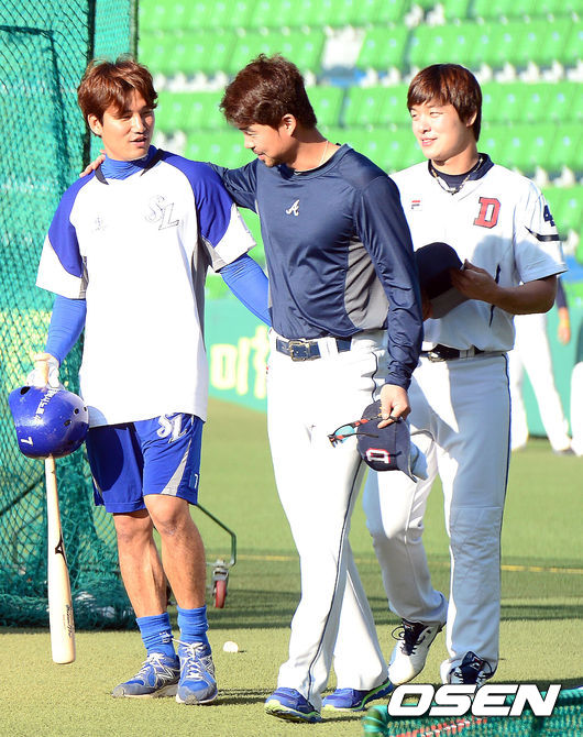 6일 오후 대구 시민구장에서 열리는 '2014 한국야쿠르트 세븐 프로야구' 삼성 라이온즈와 두산 베어스의 경기에 앞서 삼성 김상수가 두산 오재원, 민병헌과 이야기를 나누고 있다. 삼성의 선발 투수는 J.D. 마틴. 올 시즌 21차례 마운드에 올라 8승 6패를 거뒀다. 평균 자책점은 5.11. 최근 투구 내용은 그다지 좋은 편은 아니다. 지난달 두 차례 선발 등판을 통해 승패없이 평균 자책점 5.00을 거뒀다. 삼성은 두산 선발 더스틴 니퍼트만 만나면 고개를 떨궜다. 올 시즌 니퍼트에게 5패를 당했다. 두산은 4연패 수렁에 빠져 있다. 꺼져가는 4강 불씨를 되살려야 한다. 4연패 기간 중 경기당 평균 득점은 2.5에 불과했다. 타자들이 더욱 분발해야 할 상황이다. / youngrae@osen.co.kr
