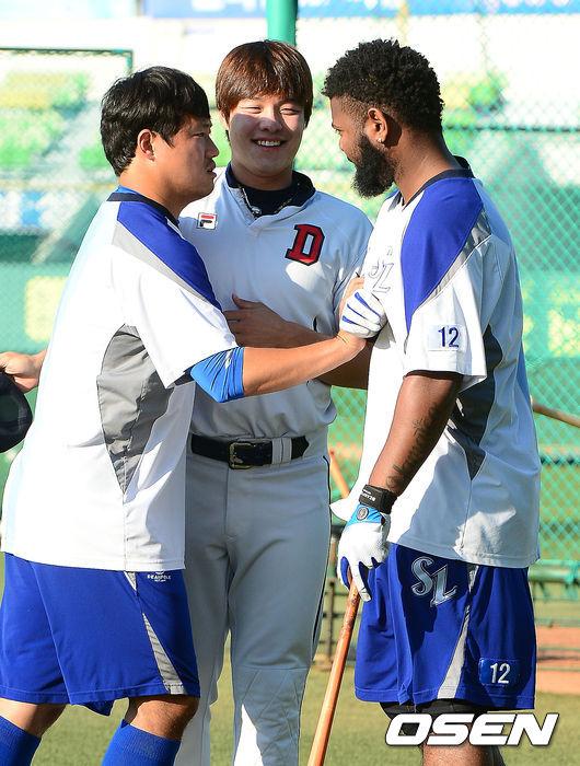6일 오후 대구 시민구장에서 열리는 '2014 한국야쿠르트 세븐 프로야구' 삼성 라이온즈와 두산 베어스의 경기에 앞서 삼성 이지영이 두산 민병헌과 이야기를 나누다 나바로에게 장난을 치고 있다. 삼성의 선발 투수는 J.D. 마틴. 올 시즌 21차례 마운드에 올라 8승 6패를 거뒀다. 평균 자책점은 5.11. 최근 투구 내용은 그다지 좋은 편은 아니다. 지난달 두 차례 선발 등판을 통해 승패없이 평균 자책점 5.00을 거뒀다. 삼성은 두산 선발 더스틴 니퍼트만 만나면 고개를 떨궜다. 올 시즌 니퍼트에게 5패를 당했다. 두산은 4연패 수렁에 빠져 있다. 꺼져가는 4강 불씨를 되살려야 한다. 4연패 기간 중 경기당 평균 득점은 2.5에 불과했다. 타자들이 더욱 분발해야 할 상황이다. / youngrae@osen.co.kr