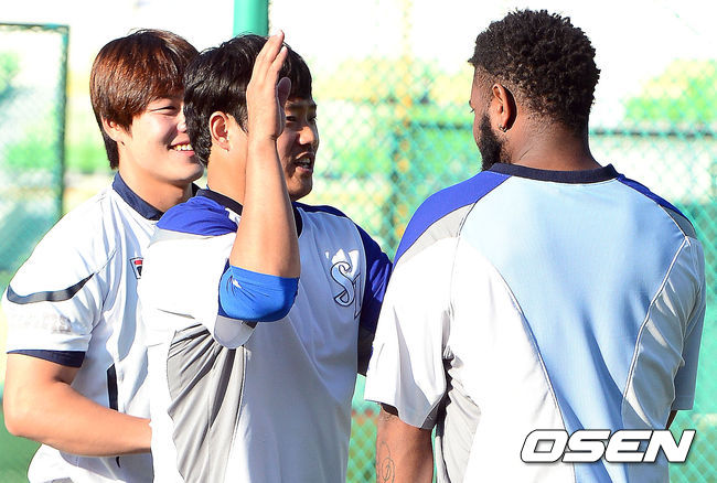 6일 오후 대구 시민구장에서 열리는 '2014 한국야쿠르트 세븐 프로야구' 삼성 라이온즈와 두산 베어스의 경기에 앞서 삼성 이지영이 나바로에게 장난을 치고 있다. 삼성의 선발 투수는 J.D. 마틴. 올 시즌 21차례 마운드에 올라 8승 6패를 거뒀다. 평균 자책점은 5.11. 최근 투구 내용은 그다지 좋은 편은 아니다. 지난달 두 차례 선발 등판을 통해 승패없이 평균 자책점 5.00을 거뒀다. 삼성은 두산 선발 더스틴 니퍼트만 만나면 고개를 떨궜다. 올 시즌 니퍼트에게 5패를 당했다. 두산은 4연패 수렁에 빠져 있다. 꺼져가는 4강 불씨를 되살려야 한다. 4연패 기간 중 경기당 평균 득점은 2.5에 불과했다. 타자들이 더욱 분발해야 할 상황이다. / youngrae@osen.co.kr