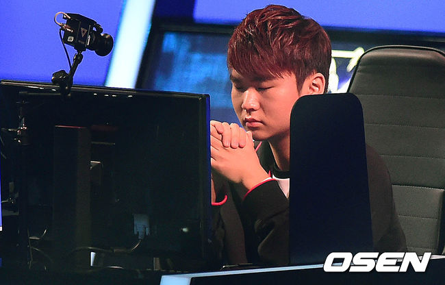나진 실드 서포터 '고릴라' 강범현이 경기 시작을 준비하며 생각에 잠겨 있다.