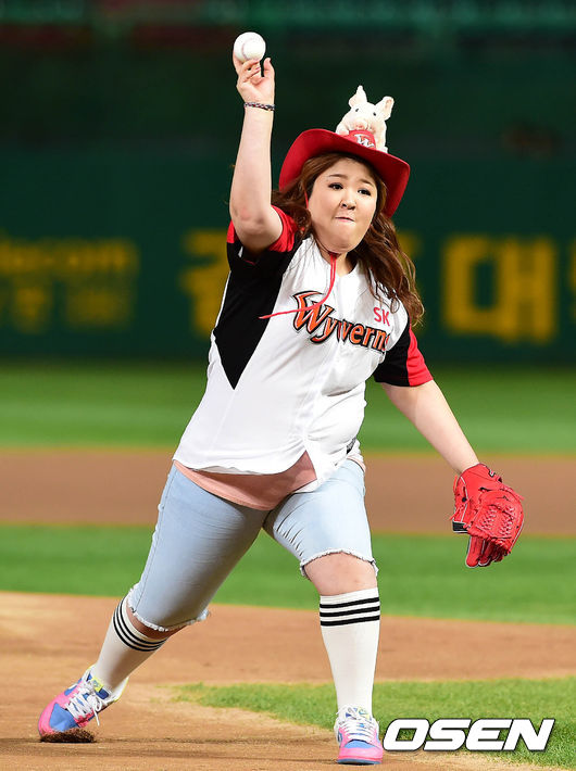 6일 오후 인천 문학구장에서 열린 '2014 한국야쿠르트 세븐 프로야구' SK 와이번스와 한화 이글스의 경기 시작전 이국주가 시구를 하고 있다.