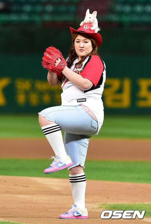 6일 오후 인천 문학구장에서 열린 '2014 한국야쿠르트 세븐 프로야구' SK 와이번스와 한화 이글스의 경기 시작전 이국주가 시구를 하고 있다.