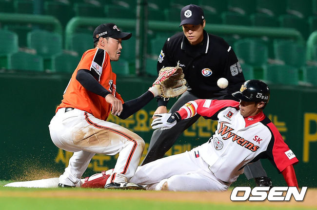 6일 오후 인천 문학구장에서 열린 '2014 한국야쿠르트 세븐 프로야구' SK 와이번스와 한화 이글스의 경기 1회말 선두타자 이명기가 우익수 오른쪽 3루타를 치고 3루에서 세이프되고 있다.