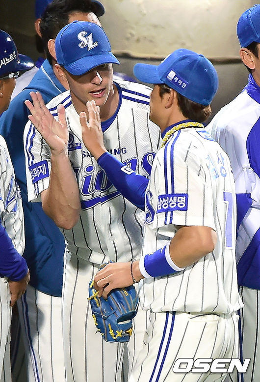 6일 오후 대구 시민구장에서 '2014 한국야쿠르트 세븐 프로야구' 삼성 라이온즈와 두산 베어스의 경기가 열렸다. 4회초 2사 삼성 마틴이 두산 민병헌의 타구를 호수비로 잡아낸 김상수와 하이파이브를 하고 있다. 삼성의 선발 투수는 J.D. 마틴. 올 시즌 21차례 마운드에 올라 8승 6패를 거뒀다. 평균 자책점은 5.11. 최근 투구 내용은 그다지 좋은 편은 아니다. 지난달 두 차례 선발 등판을 통해 승패없이 평균 자책점 5.00을 거뒀다. 삼성은 두산 선발 더스틴 니퍼트만 만나면 고개를 떨궜다. 올 시즌 니퍼트에게 5패를 당했다. 두산은 4연패 수렁에 빠져 있다. 꺼져가는 4강 불씨를 되살려야 한다. 4연패 기간 중 경기당 평균 득점은 2.5에 불과했다. 타자들이 더욱 분발해야 할 상황이다. / youngrae@osen.co.kr