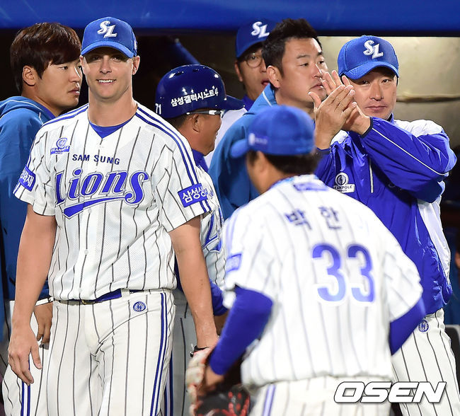 6일 오후 대구 시민구장에서 '2014 한국야쿠르트 세븐 프로야구' 삼성 라이온즈와 두산 베어스의 경기가 열렸다. 4회초 수비를 마친 삼성 마틴이 두산 최주환이 타구를 호수비로 잡아낸 박한이를 기다리고 있다. 삼성의 선발 투수는 J.D. 마틴. 올 시즌 21차례 마운드에 올라 8승 6패를 거뒀다. 평균 자책점은 5.11. 최근 투구 내용은 그다지 좋은 편은 아니다. 지난달 두 차례 선발 등판을 통해 승패없이 평균 자책점 5.00을 거뒀다. 삼성은 두산 선발 더스틴 니퍼트만 만나면 고개를 떨궜다. 올 시즌 니퍼트에게 5패를 당했다. 두산은 4연패 수렁에 빠져 있다. 꺼져가는 4강 불씨를 되살려야 한다. 4연패 기간 중 경기당 평균 득점은 2.5에 불과했다. 타자들이 더욱 분발해야 할 상황이다. / youngrae@osen.co.kr