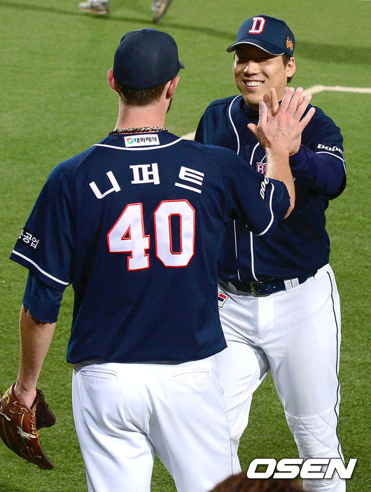 6일 오후 대구 시민구장에서 '2014 한국야쿠르트 세븐 프로야구' 삼성 라이온즈와 두산 베어스의 경기가 열렸다. 5회말 2사 두산 니퍼트가 삼성 이지영의 타구를 잡아낸 김현수와 기뻐하고 있다. 삼성의 선발 투수는 J.D. 마틴. 올 시즌 21차례 마운드에 올라 8승 6패를 거뒀다. 평균 자책점은 5.11. 최근 투구 내용은 그다지 좋은 편은 아니다. 지난달 두 차례 선발 등판을 통해 승패없이 평균 자책점 5.00을 거뒀다. 삼성은 두산 선발 더스틴 니퍼트만 만나면 고개를 떨궜다. 올 시즌 니퍼트에게 5패를 당했다. 두산은 4연패 수렁에 빠져 있다. 꺼져가는 4강 불씨를 되살려야 한다. 4연패 기간 중 경기당 평균 득점은 2.5에 불과했다. 타자들이 더욱 분발해야 할 상황이다. / youngrae@osen.co.kr
