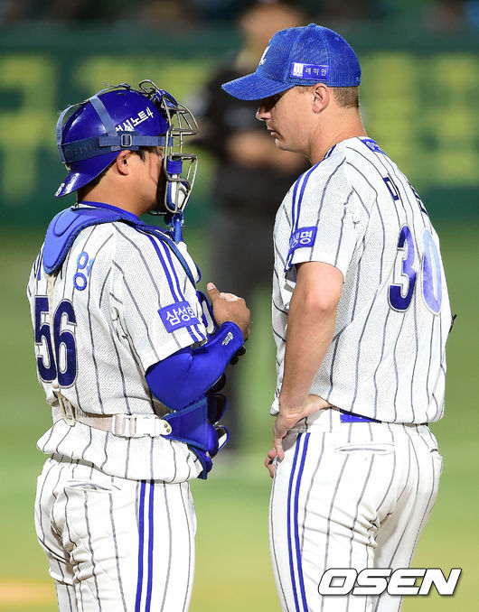 6일 오후 대구 시민구장에서 '2014 한국야쿠르트 세븐 프로야구' 삼성 라이온즈와 두산 베어스의 경기가 열렸다. 6회초 2사 만루 두산 홍성흔 타석때 삼성 이지영과 마틴이 이야기를 나누고 있다. 삼성의 선발 투수는 J.D. 마틴. 올 시즌 21차례 마운드에 올라 8승 6패를 거뒀다. 평균 자책점은 5.11. 최근 투구 내용은 그다지 좋은 편은 아니다. 지난달 두 차례 선발 등판을 통해 승패없이 평균 자책점 5.00을 거뒀다. 삼성은 두산 선발 더스틴 니퍼트만 만나면 고개를 떨궜다. 올 시즌 니퍼트에게 5패를 당했다. 두산은 4연패 수렁에 빠져 있다. 꺼져가는 4강 불씨를 되살려야 한다. 4연패 기간 중 경기당 평균 득점은 2.5에 불과했다. 타자들이 더욱 분발해야 할 상황이다. / youngrae@osen.co.kr