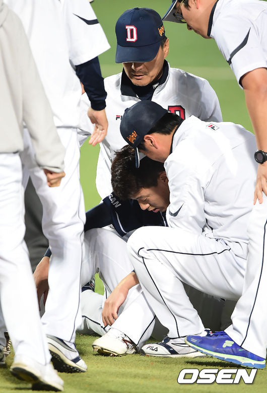 6일 오후 대구 시민구장에서 '2014 한국야쿠르트 세븐 프로야구' 삼성 라이온즈와 두산 베어스의 경기가 열렸다. 7회말 1사 두산 오현택이 가슴 통증을 호소하고 있다. 삼성의 선발 투수는 J.D. 마틴. 올 시즌 21차례 마운드에 올라 8승 6패를 거뒀다. 평균 자책점은 5.11. 최근 투구 내용은 그다지 좋은 편은 아니다. 지난달 두 차례 선발 등판을 통해 승패없이 평균 자책점 5.00을 거뒀다. 삼성은 두산 선발 더스틴 니퍼트만 만나면 고개를 떨궜다. 올 시즌 니퍼트에게 5패를 당했다. 두산은 4연패 수렁에 빠져 있다. 꺼져가는 4강 불씨를 되살려야 한다. 4연패 기간 중 경기당 평균 득점은 2.5에 불과했다. 타자들이 더욱 분발해야 할 상황이다. / youngrae@osen.co.kr