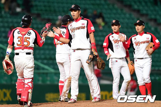 6일 오후 인천 문학구장에서 열린 '2014 한국야쿠르트 세븐 프로야구' SK 와이번스와 한화 이글스의 경기 종료 후 SK 선수들이 하이파이브를 하고 있다.
