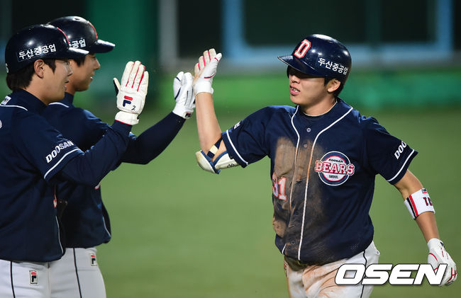 6일 오후 대구 시민구장에서 '2014 한국야쿠르트 세븐 프로야구' 삼성 라이온즈와 두산 베어스의 경기가 열렸다. 연장 11회초 2사 만루 두산 정수빈이 안타를 때리고 3루까지 진루한 뒤 삼성 나바로의 실책으로 득점을 올린 뒤 동료들과 기뻐하고 있다. 삼성의 선발 투수는 J.D. 마틴. 올 시즌 21차례 마운드에 올라 8승 6패를 거뒀다. 평균 자책점은 5.11. 최근 투구 내용은 그다지 좋은 편은 아니다. 지난달 두 차례 선발 등판을 통해 승패없이 평균 자책점 5.00을 거뒀다. 삼성은 두산 선발 더스틴 니퍼트만 만나면 고개를 떨궜다. 올 시즌 니퍼트에게 5패를 당했다. 두산은 4연패 수렁에 빠져 있다. 꺼져가는 4강 불씨를 되살려야 한다. 4연패 기간 중 경기당 평균 득점은 2.5에 불과했다. 타자들이 더욱 분발해야 할 상황이다. / youngrae@osen.co.kr