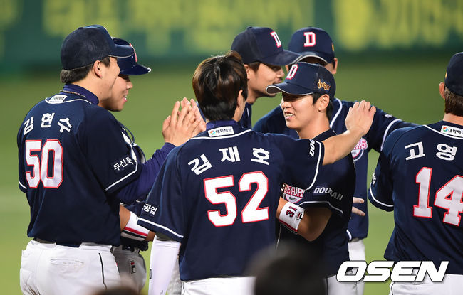 두산 베어스가 삼성 라이온즈를 꺾고 4연패 사슬을 끊었다. 두산은 6일 대구구장에서 열린 삼성과의 경기에서 연장 11회 정수빈의 결승타에 힘입어 5-1로 승리했다. 지난 2일 광주 KIA전 이후 4연패 탈출. 1번 정수빈은 결승타를 포함해 6타수 3안타 3타점으로 최고의 활약을 펼쳤다. 반면 삼성은 연장 혈투 끝에 쓰라린 패배를 당하며 연승 행진을 '4'에서 마쳤다. 승리를 거둔 두산 선수들이 기뻐하고 있다. / youngrae@osen.co.kr