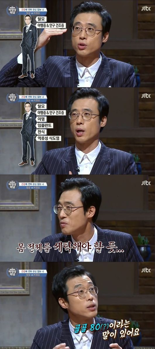 그는 6일 방송된 JTBC 예능프로그램 ‘비정상회담’에서 자신이 건강에 대해 관심이 없다고 말하면서 “중병은 없다. 다만 잔병이 많다”라고 말했다.