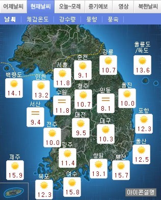 아침 최저기온은 오전 7시 현재 서울 11.8도, 인천 13.2도, 전주 10.0도, 대구 10.3도, 안동 8.1도, 부산 15.7도를 보이고 있다. 낮 최고기온은 21도에서 24도까지 분포하면서 어제와 비슷하겠다. 당분간 큰 일교차가 예상되니 환절기 건강관리가 필요하다.