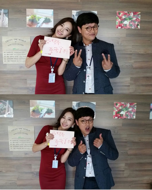 사진 속 한소영은 '잉여공주 중국 1위'라고 쓴 대본을 들고, 코믹한 표정을 짓고 있는 김민교와 정면을 응시하며 활짝 웃고 있다.