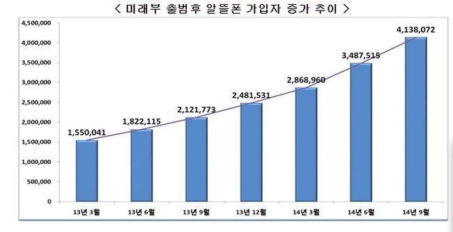 미래부 출범 이후 알뜰폰 가입자수는 월 평균 14.3만명 수준으로 꾸준히 증가했으며, 특히 2014년 2분기에는 20만6000명, 3분기에는 21만6000명으로 2014년 들어 가입자수 증가가 두드러졌다.