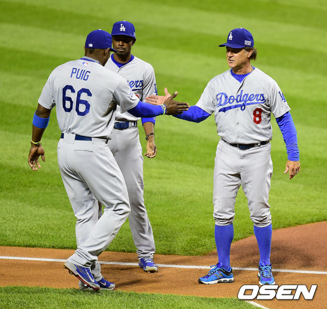 7일(이하 한국시간) 미국 미주리주 세인트루이스에 위치한 부시스타디움에서 벌어진 2014 메이저리그 LA 다저스와 세인트루이스 카디널스의 디비전시리즈(NLDS·5전3승제) 3차전, 식전행사에서 매팅리 감독이 푸이그와 하이파이브를 하고 있다.