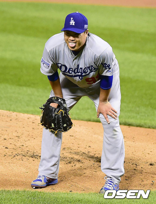 7일(이하 한국시간) 미국 미주리주 세인트루이스에 위치한 부시스타디움에서 벌어진 2014 메이저리그 LA 다저스와 세인트루이스 카디널스의 디비전시리즈(NLDS·5전3승제) 3차전,1회말 2사 할러데이에 던진 한복판 공을 구심이 볼로 선언하자 류현진이 혀를 내밀고  있다.