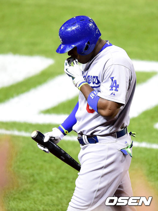 7일(이하 한국시간) 미국 미주리주 세인트루이스에 위치한 부시스타디움에서 벌어진 2014 메이저리그 LA 다저스와 세인트루이스 카디널스의 디비전시리즈(NLDS·5전3승제) 3차전,1회말 무사 1루 푸이그가 감진으로 물러나고 있다.