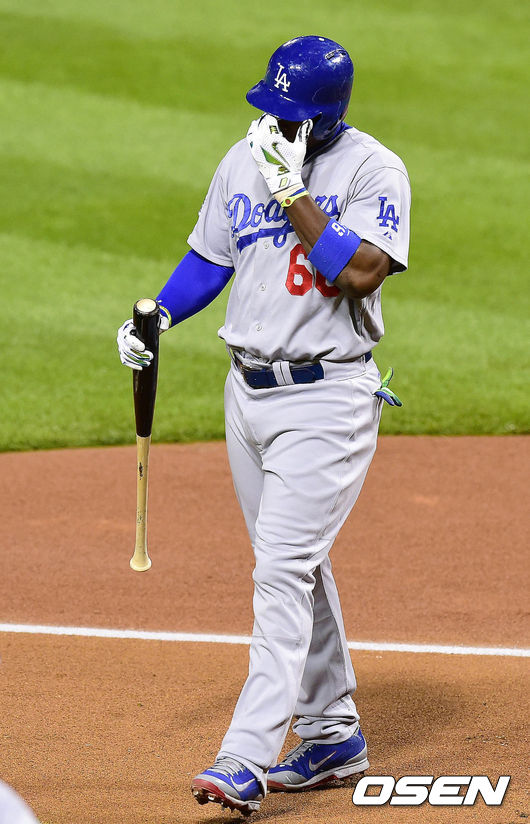 7일(이하 한국시간) 미국 미주리주 세인트루이스에 위치한 부시스타디움에서 벌어진 2014 메이저리그 LA 다저스와 세인트루이스 카디널스의 디비전시리즈(NLDS·5전3승제) 3차전,3회초 1사 푸이그가 첫 타석에 이어 두 번째 타석에서도 삼진을 당하고 있다.