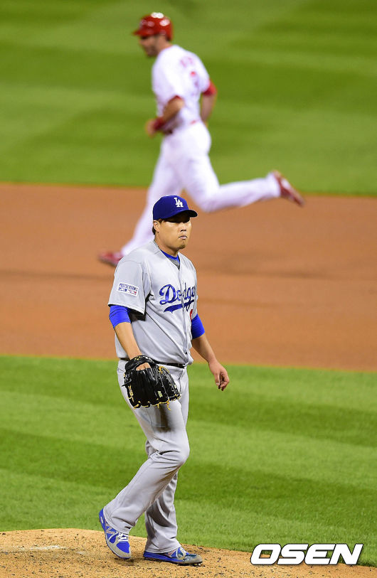 7일(이하 한국시간) 미국 미주리주 세인트루이스에 위치한 부시스타디움에서 벌어진 2014 메이저리그 LA 다저스와 세인트루이스 카디널스의 디비전시리즈(NLDS·5전3승제) 3차전,3회말 무사 류현진이 카펜터에게 홈런을 허용하고 아쉬워 하고 있다.