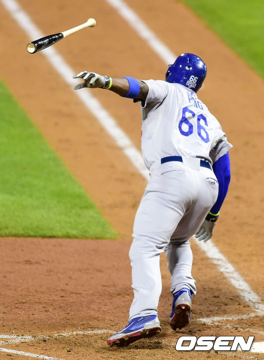7일(이하 한국시간) 미국 미주리주 세인트루이스에 위치한 부시스타디움에서 벌어진 2014 메이저리그 LA 다저스와 세인트루이스 카디널스의 디비전시리즈(NLDS·5전3승제) 3차전,6회초 선두타자 푸이그 우익선상 3루타를 날리고 있다.