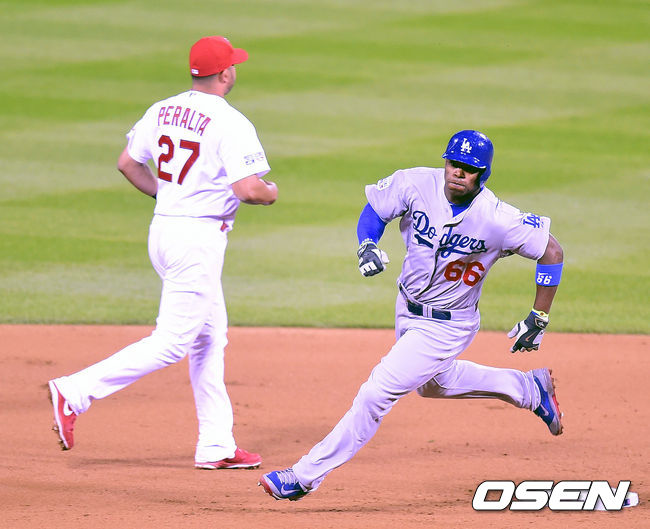 7일(이하 한국시간) 미국 미주리주 세인트루이스에 위치한 부시스타디움에서 벌어진 2014 메이저리그 LA 다저스와 세인트루이스 카디널스의 디비전시리즈(NLDS·5전3승제) 3차전,6회초 선두타자 푸이그 우익선상 안타를 날리고 3루까지 진루하고 있다.