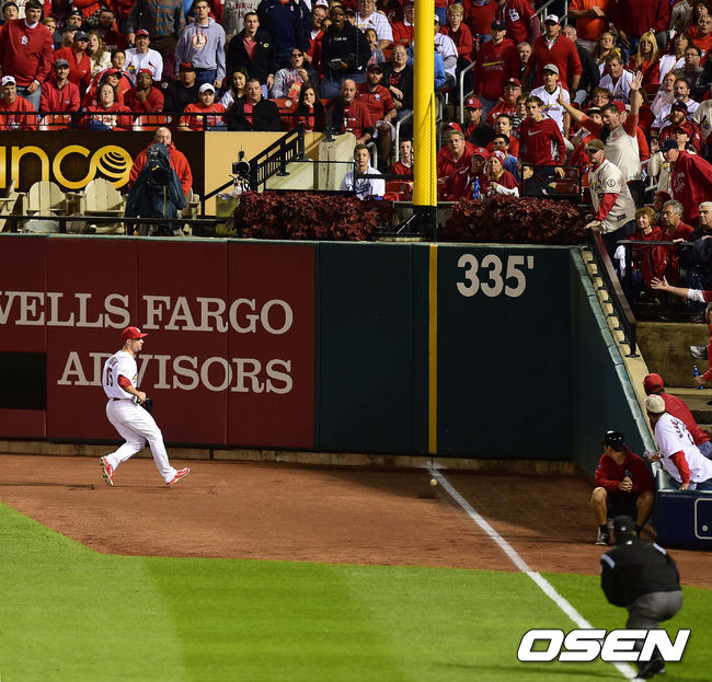 7일(이하 한국시간) 미국 미주리주 세인트루이스에 위치한 부시스타디움에서 벌어진 2014 메이저리그 LA 다저스와 세인트루이스 카디널스의 디비전시리즈(NLDS·5전3승제) 3차전,6회초 선두타자 푸이그가 우익선상 안타를 날리자 카디널스 팬들이 공을 바라보고 있다.