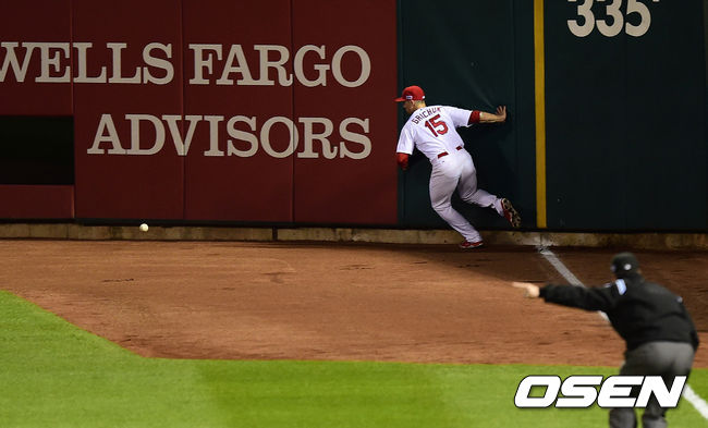 7일(이하 한국시간) 미국 미주리주 세인트루이스에 위치한 부시스타디움에서 벌어진 2014 메이저리그 LA 다저스와 세인트루이스 카디널스의 디비전시리즈(NLDS·5전3승제) 3차전,6회초 선두타자 푸이그의 우익선상 안타때 팬스를 맞고 굴절이 되자 우익수 랜달 그릭처가 공을 따라가고 있다.