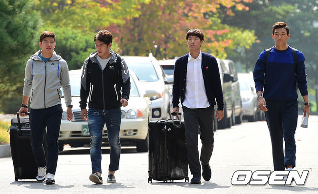 축구대표팀 박주호(왼쪽부터), 이용, 조영철, 김승규가 7일 오전 파주 NFC(국가대표 트레이닝센터)에 들어서고 있다.