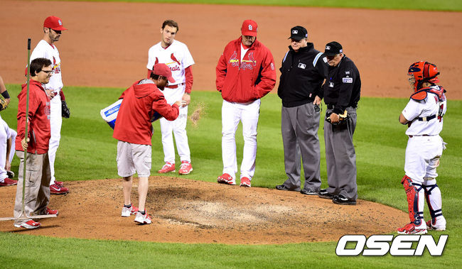 9회초 세인트루이스 매서니 감독이 마운드 상태를 점검하고 있다./jpnews@osen.co.kr