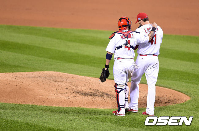 6회초 2사 3루에서 세인트루이스 랙키가 다저스 라미레즈가 적시타를 허용하며 동점이 되자 몰리나 격려하고 있다./jpnews@osen.co.kr