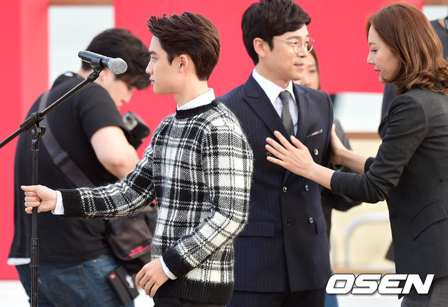 그룹 엑소의 멤버 디오(도경수)가 무대인사를 마친 뒤 포토타임을 준비하며 마이크를 정리하고 있다.