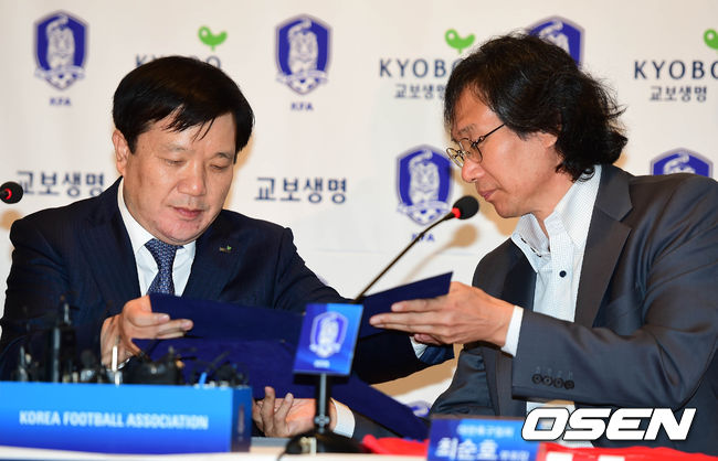 7일 오후 파주 NFC(국가대표 트레이닝센터)에서 열린 2014-2018 KFA 및 축구국가대표팀-교보생명 공식후원계약 조인식에서 최순호 대한축구협회 부회장(오른쪽)과 교보생명 이병성 부사장이 후원계약서를 교환 하고 있다.