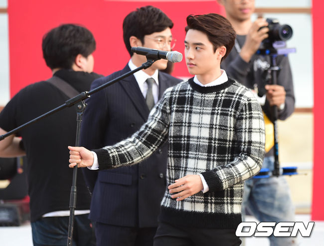 그룹 엑소의 멤버 디오(도경수)가 무대인사를 마치고 포토타임을 준비하며 마이크를 정리하고 있다.