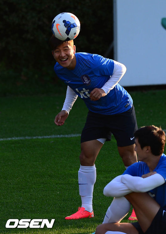 축구대표팀 박주호가 7일 오후 파주 NFC(국가대표 트레이닝센터)에서 훈련을 하며 장난을 치고 있다.