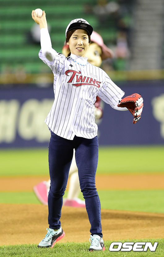 7일 오후 서울 잠실구장에서 열린 '2014 한국야쿠르트 세븐 프로야구 LG 트윈스와 삼성 라이온즈의 경기, 경기시작 전 2014 인천 아시안게임 조정 금메달리스트 지유진이 시구를하고 있다.