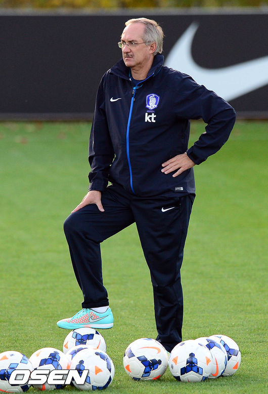 축구대표팀 슈틸리케 감독이 7일 오후 파주 NFC(국가대표 트레이닝센터)에서 선수들이 몸을 푸는 모습을 바라보고 있다.