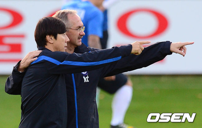 축구대표팀 슈틸리케 감독과 신태용 코치가 7일 오후 파주 NFC(국가대표 트레이닝센터)에서 훈련중 이야기를 나누고 있다.
