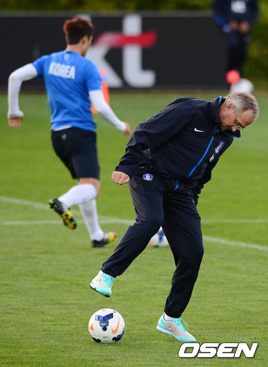 축구대표팀 슈틸리케 감독이 7일 오후 파주 NFC(국가대표 트레이닝센터)에서 훈련 중 날아온 볼을 잡고 있다.