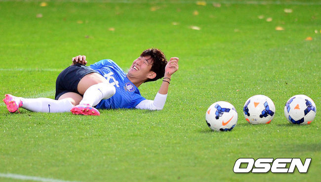 축구대표팀 손흥민이 7일 오후 파주 NFC(국가대표 트레이닝센터)에서 훈련 중 넘어진 후 미소를 짓고 있다.