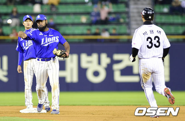 7일 오후 서울 잠실구장에서 열린 '2014 한국야쿠르트 세븐 프로야구 LG 트윈스와 삼성 라이온즈의 경기, 6회말 1사 주자 1루, 삼성 나바로가 LG 이진영의 타구를 병살처리하고 있다.