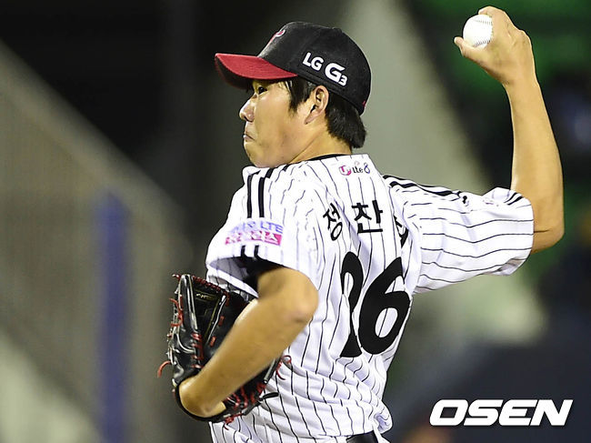 7일 오후 서울 잠실구장에서 열린 '2014 한국야쿠르트 세븐 프로야구 LG 트윈스와 삼성 라이온즈의 경기, 7회초 2사 주자 1,2루, LG 신재웅의 뒤를 이어 마운드에 오른 정찬헌이 힘차게 공을 던지고 있다.