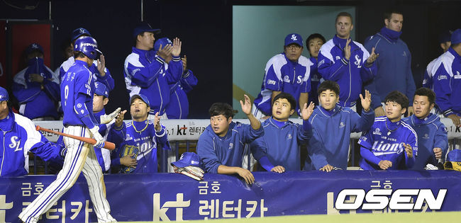 7일 오후 서울 잠실구장에서 열린 '2014 한국야쿠르트 세븐 프로야구 LG 트윈스와 삼성 라이온즈의 경기, 8회초 1사 주자 2루, 삼성 나바로의 안타에 홈을 밟은 2루주자 강명구가 더그아웃에서 기쁨을 나누고 있다.